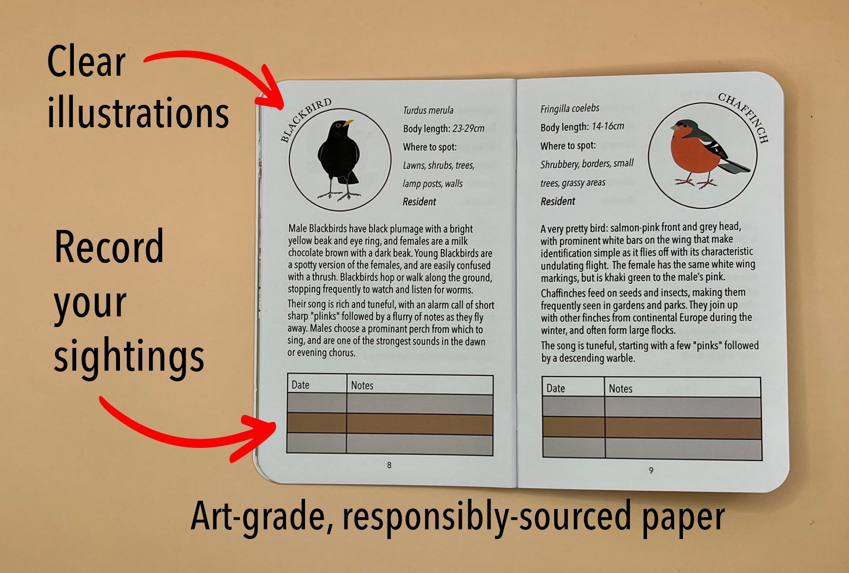 They are a 9 x 14cm pocketbook with rounded corners, and a sturdy cover to protect the book when you’re out and about. Each page has a little table where you can jot down the date as well as the location, weather, or other aide memoire to help you build up a bank of information about the birds you see. There are also a couple of blank pages at the back for notes and sketches, and a quick ticklist to record your progress.